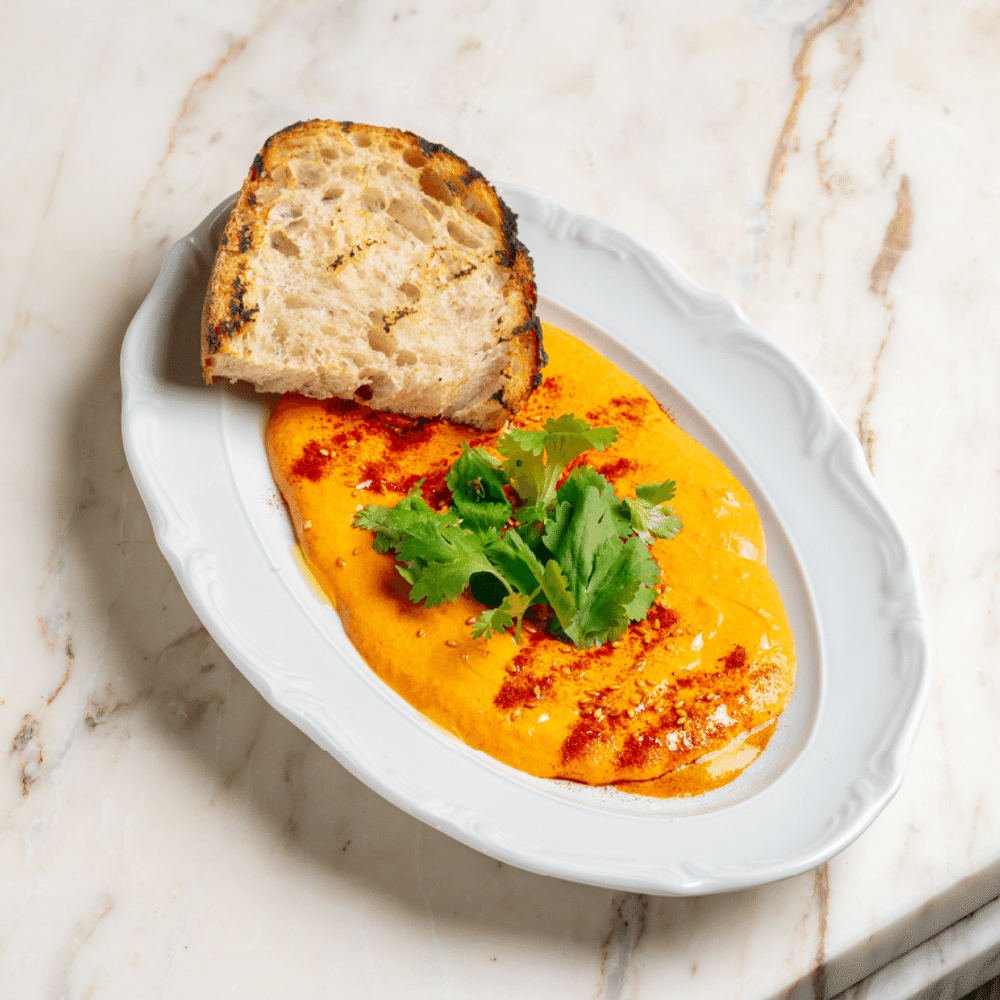 Крем из печеного перца со сливочным сыром, чесноком и соком лимона. Украшаем чили-маслом, кинзой и кунжутом. Подаем с тосто домашнего тартина