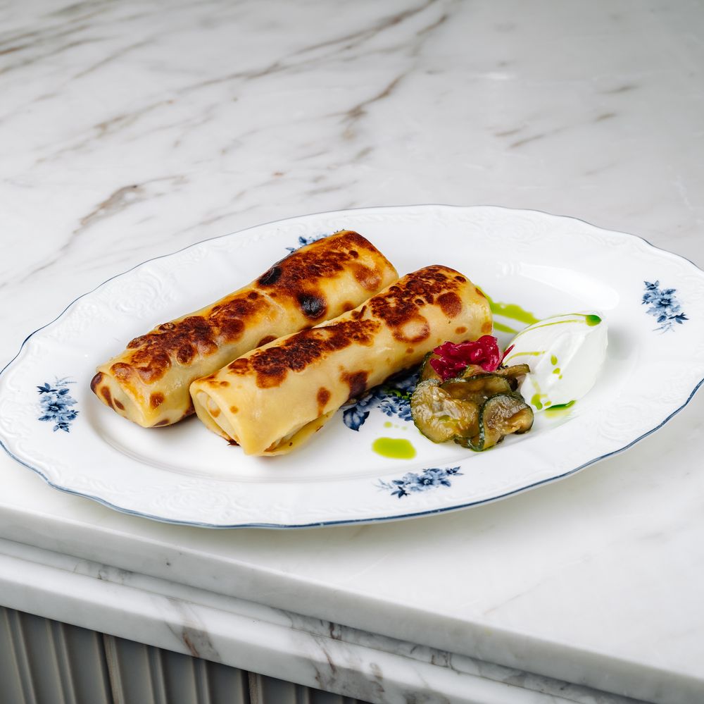 Блины (яйцо, мука пшеничная, молоко, сметана, сахар, соль), фарш сальсичо (говядина грудинка мраморная, лук, масло сливочное, масло оливковое, специи, соль), сметана, битые огурцы (огурцы свежие, маринад (соус соевый, соус кимчи, соус рисовый мирин, чеснок свежий, кинза свежая), паста трюфельная, лук маринованный