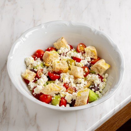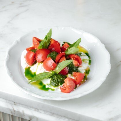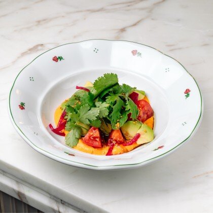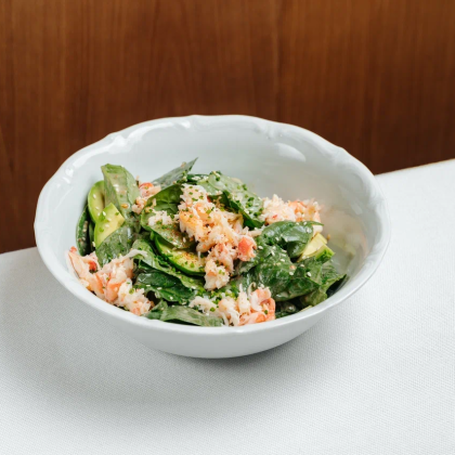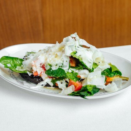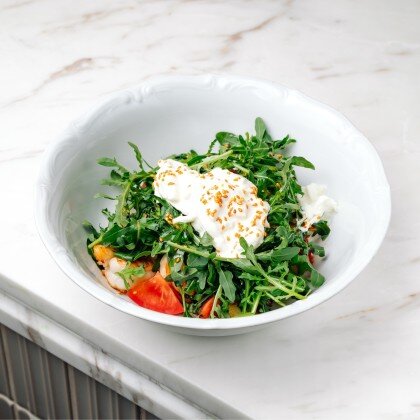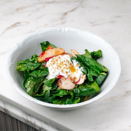 Печеная свекла, мини-картофель и утка конфи, обжаренные на сливочном масле, салат ромейн, шпинат, руккола, маринованный лук, кунжут, лук-шнитт, брынза, пеккорино. Соус: мёд, горчица, оливковое масло, сок лимона, тёртый пармезан.
