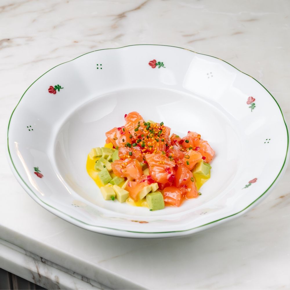 Тартар из лосося с соусом каламанси