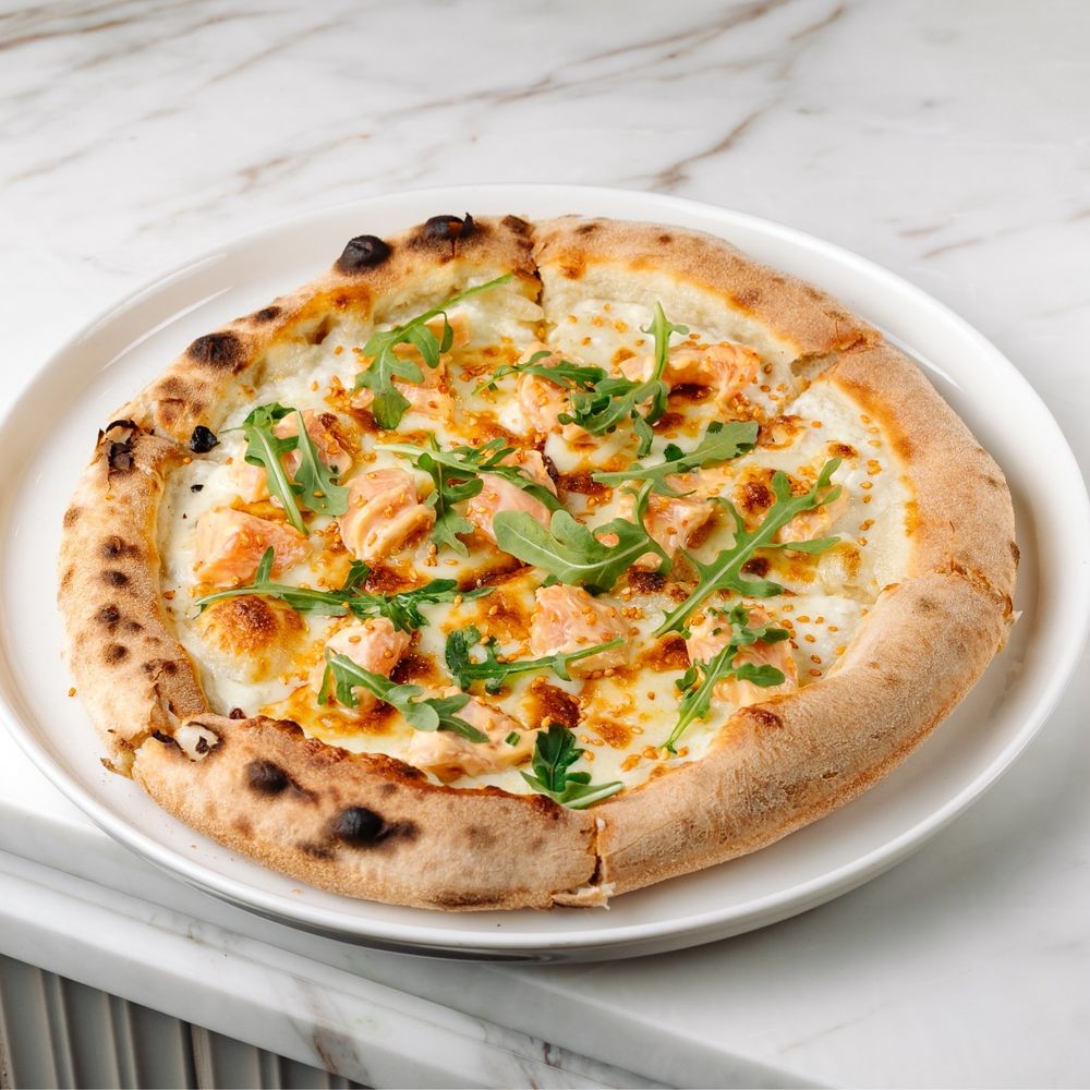 Неаполитанская пицца с пышным бортиком и тонкой основой (мука из мягких сортов пшеницы, дрожжи живые, сухая итальянская закваска, вода, соль), сливочный соус, сыр моцарелла, сыр маскарпоне, свежий лосось , спайси соус (майонез, табаджан, мирин, кунжутное масло, соевый соус, рисовый уксус мицукан) салат руккола , шнитт лук (24 см)