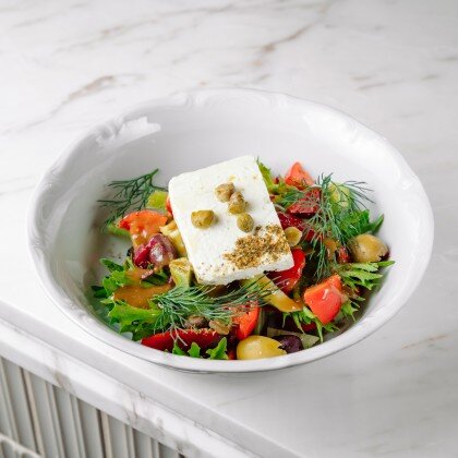 Шпинат, томаты, картофель стоун, лук маринованный, осьминог, цедра лимона, греческая заправка (сметана, соль, сок лимона, огурец, зелень)
