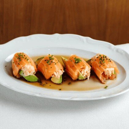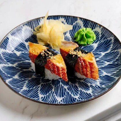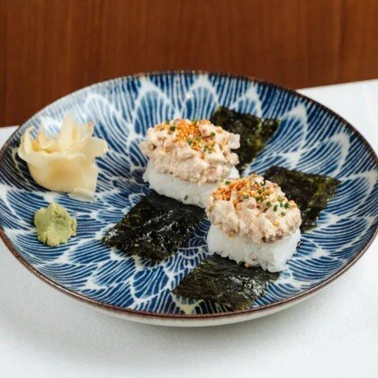 Крабовое мясо, спайси-соус (майонез, табаджан, кунжутное масло, мирин), огурец, рис и хрустящий нори. Украшен шнитт луком и кунжутом кимчи, имбирь маринованный, натуральный васаби. (1 шт)