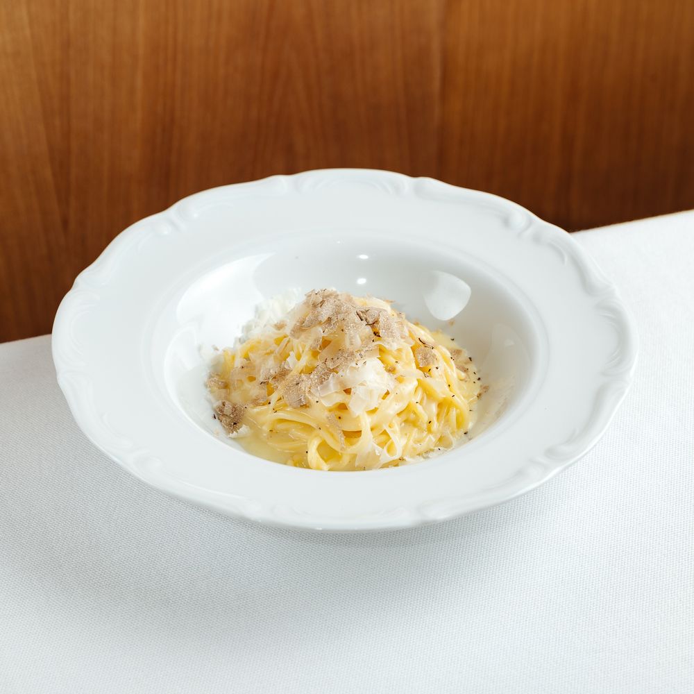 Паста домашняя (мука семола, яйцо куриное, мука пшеничная, масло оливковое, соль), бульон куриный, масло сливочное, пармезан, масло трюфельное, трюфель чёрный свежий