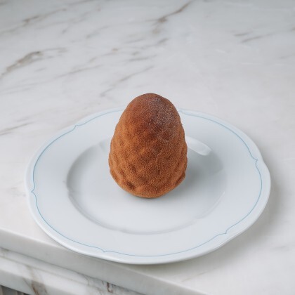Кокосовый дакуаз (бисквит на белках, с кокосовой стружкой), мусс на кокосовых сливках, малиновый конфитюр, корпус из белого шоколада. Помпон из пластичного шоколада и декор из кокосовой стружки.