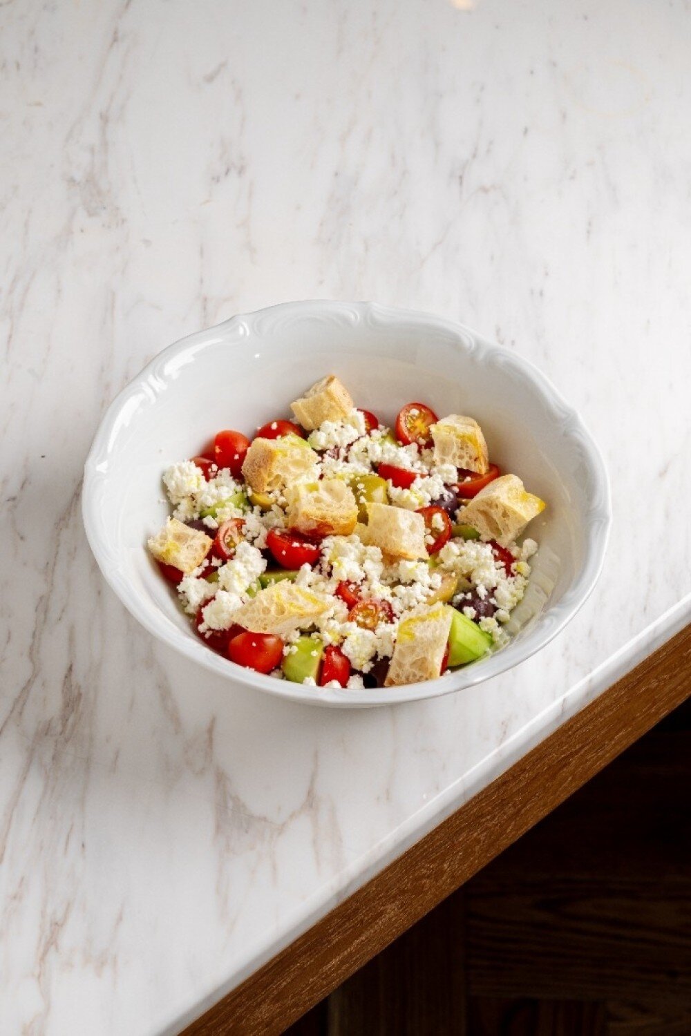 Предзаказ за 2 дня Томаты свежие, сыр брынза, огурцы свежие, перец рамиро, лук красный маринованный, оливки каламата консервированные, соус греческий (масло оливковое, уксус бальзамический, сироп сахарный, перец, соль), сухарики из тартина