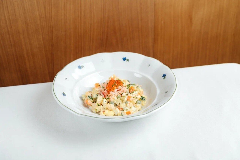 Предзаказ за 2 дня Отварные картофель и морковь, яйцо, свежий горошек, маринованный огурец, свежий огурец, краб, красная икра, лук шнитт. Соус: японский майонез, горчица дижонская, желток. Украшается красной икрой.