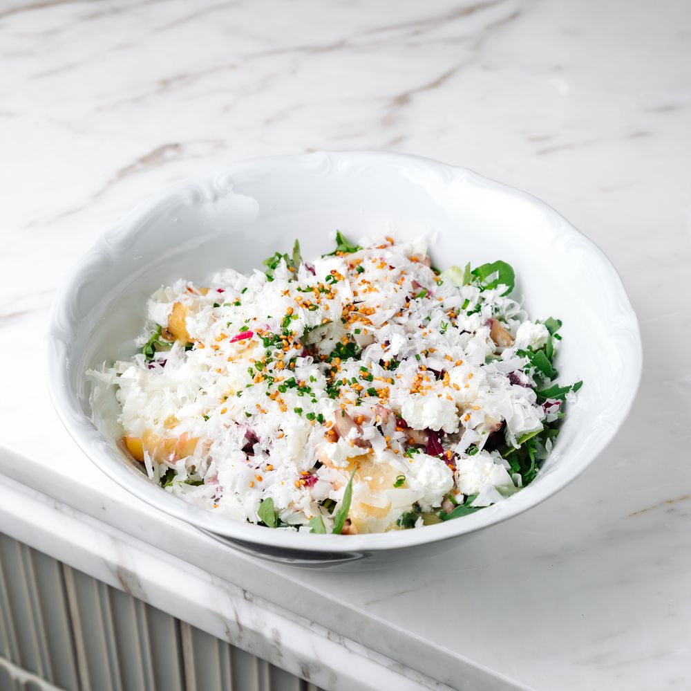Печеная свекла, мини-картофель и утка конфи, обжаренные на сливочном масле, салат ромейн, шпинат, руккола, маринованный лук, кунжут, лук-шнитт, брынза, пеккорино. Соус: мёд, горчица, оливковое масло, сок лимона, тёртый пармезан.