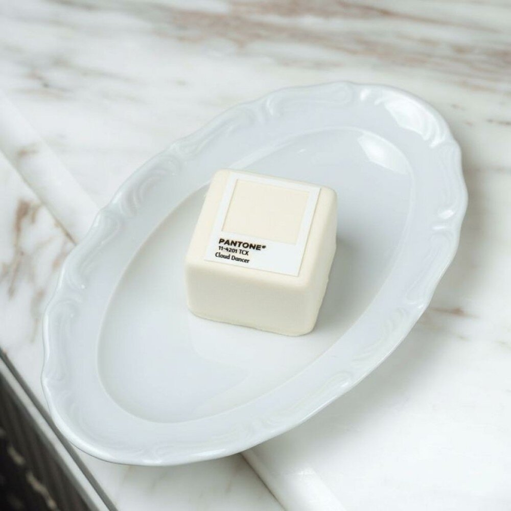 Хрустящий слой из белого шоколада и шариков криспи, Ванильный мусс на белом шоколаде, начинка из пюре мякоти кокоса с соком лайма