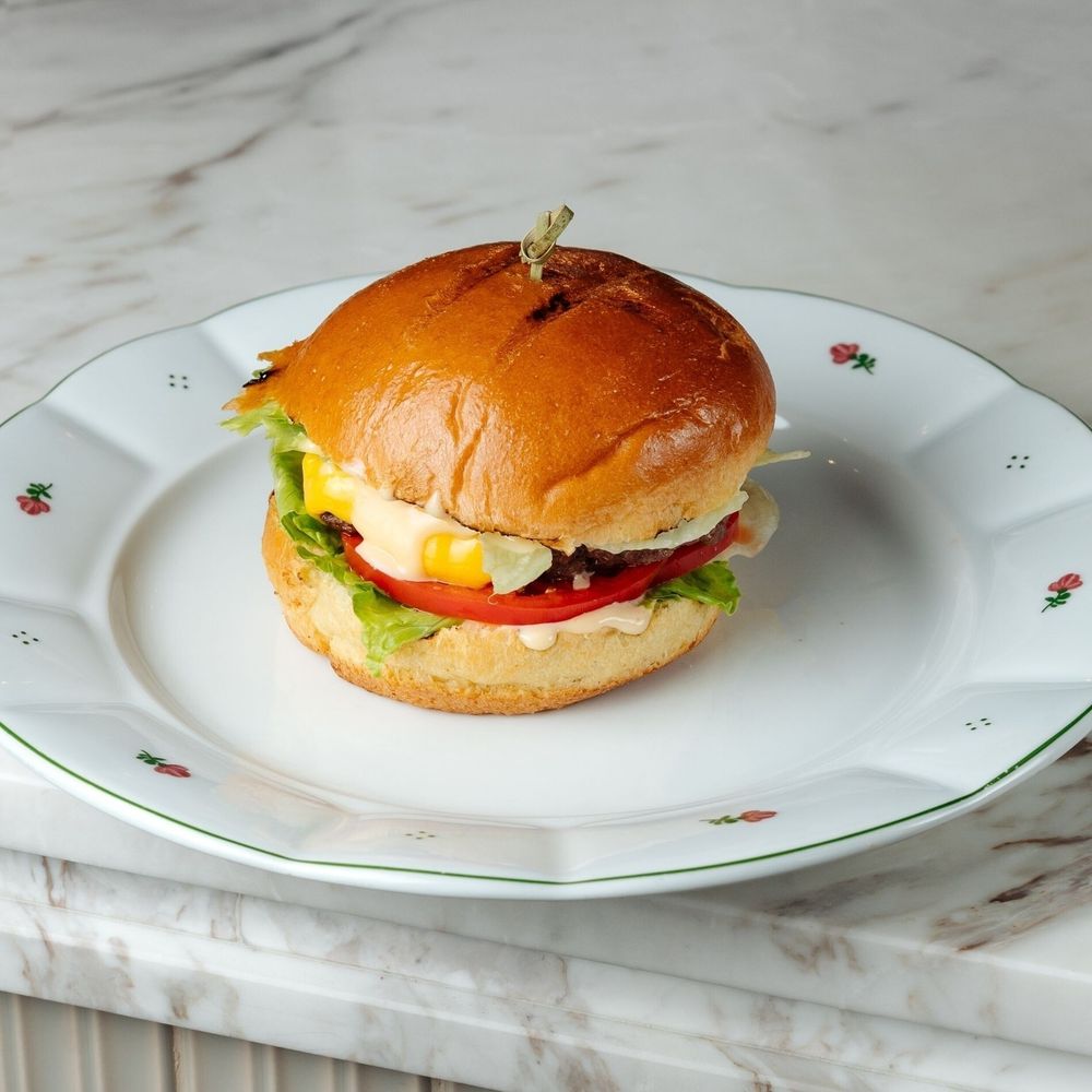 Булочка бриошь, котлета говяжья, сыр чеддер, томаты свежие, салат айсберг, лук карамелизованный, соус гольф (майонез, сладкий чили)