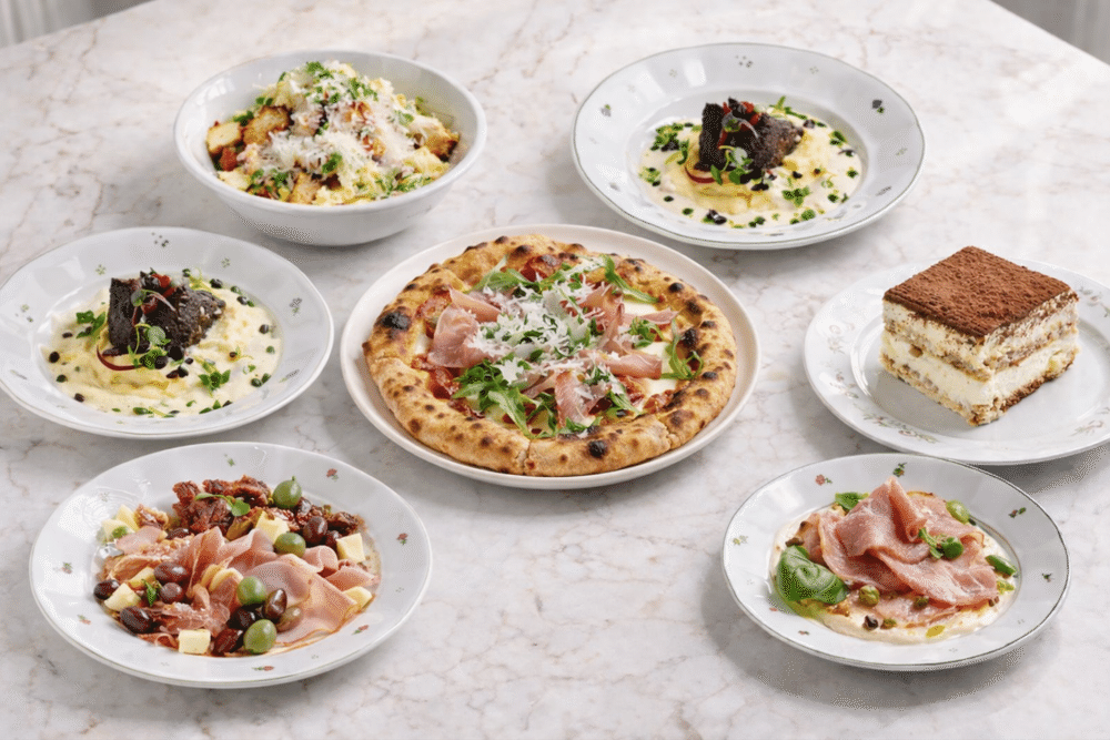 Антипасти, вителло тоннато, цезарь с цыплёнком, пицца с пармской ветчиной, говяжька щека (2шт), домашний тирамису