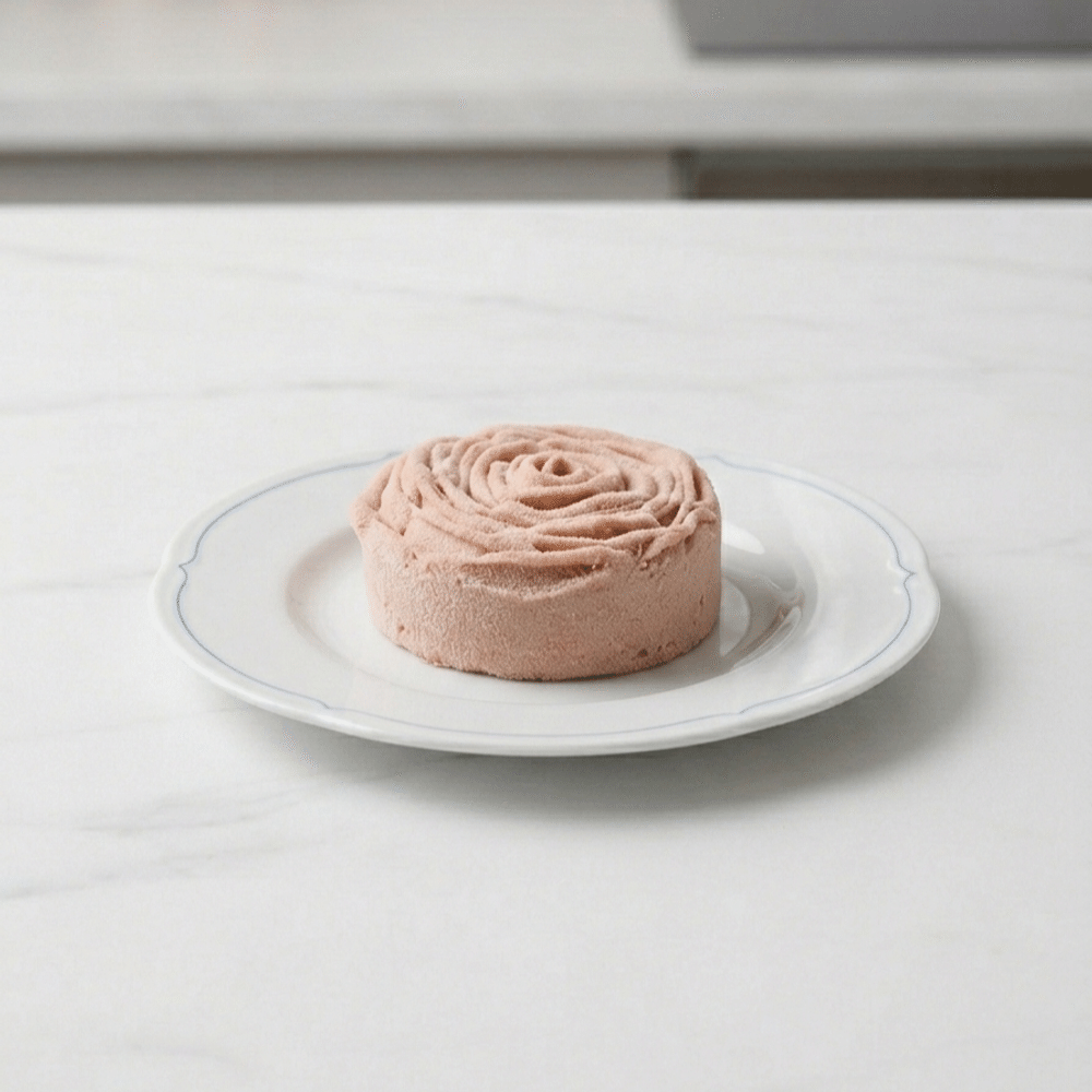 Основа из миндального сабле, начинка манго-маракуйя, заварной крем на основе миндально-фундучного пралине и карамели. Покрыта велюром на белом шоколаде