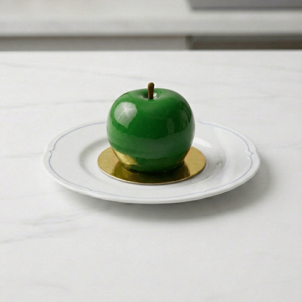 Ганаш на основе тархуна, белого шоколада и сливок. Начинка из яблочного пюре с кусочками яблока. Корпус из зеркальной глазури (сливки, шоколад, крахмал, желатин, глюкоза)