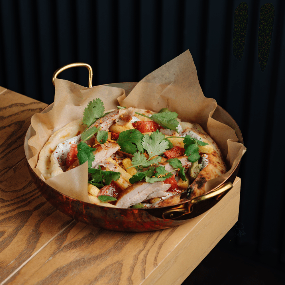 Домашняя пита (мука, йогурт греческий, сыр фета, масло оливковое, соль, сахар, дрожжи, уксус столовый), йогуртовый соус (йогурт греческий, кефир, соль, специи, кинза, укроп, чеснок), куриное бедро, свежие томаты, картофель фри, кинза, петрушка, оливки Каламата, кунжут кимчи