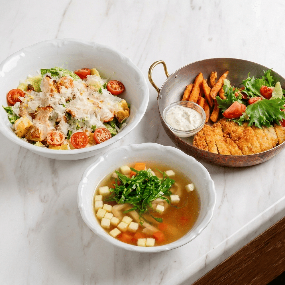 Куриный бульон, цезарь с цыпленком, куриный шницель с бататом фри