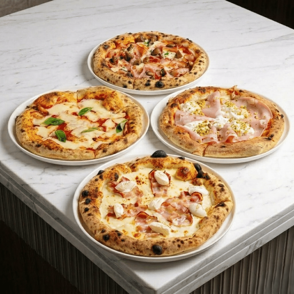 Пицца маргарита, Пицца ветчина - грибы, Пицца с беконом и маскарпоне, Пицца мортаделла и фисташки