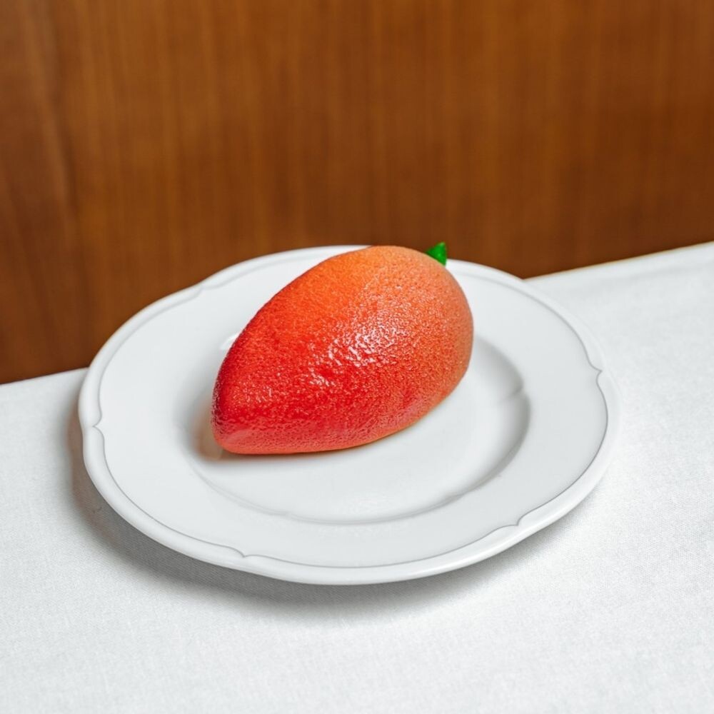 Заварной мусс из белого шоколада со сливками с добавлением маракуйи. Начинка из мангового крема (манговое пюре, желток, сахар) с кусочками манго. Корпус из белого шоколада с какао-маслом