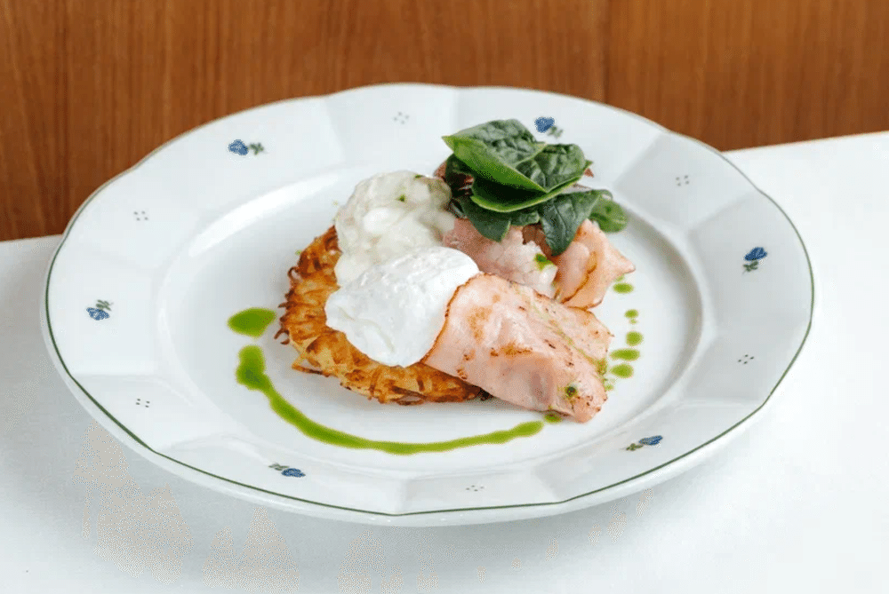 Драник (картофель, яйцо куриное, мука пшеничная, лук-шалот, масло растительное, соль, специи), салатный микс (шпинат свежий и радичио свежие), страчателла, яйцо пашот, обжаренный тамбовский окорок, зелёное масло