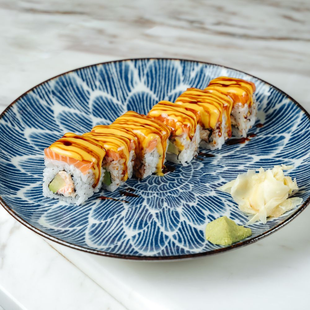 Рис для суши (рис отварной, уксус рисовый, сахар белый), филе охлажденного лосося, авокадо, соус унаги, краб, соус каламанси (майонез, соус умами юзу), лук зеленый, соус спайси (майонез, паста табаджан, соус табаско, соус кимчи, специи), водоросли нори, микрозелень, соус соевый, имбирь маринованный, натуральный васаби (6 шт.)