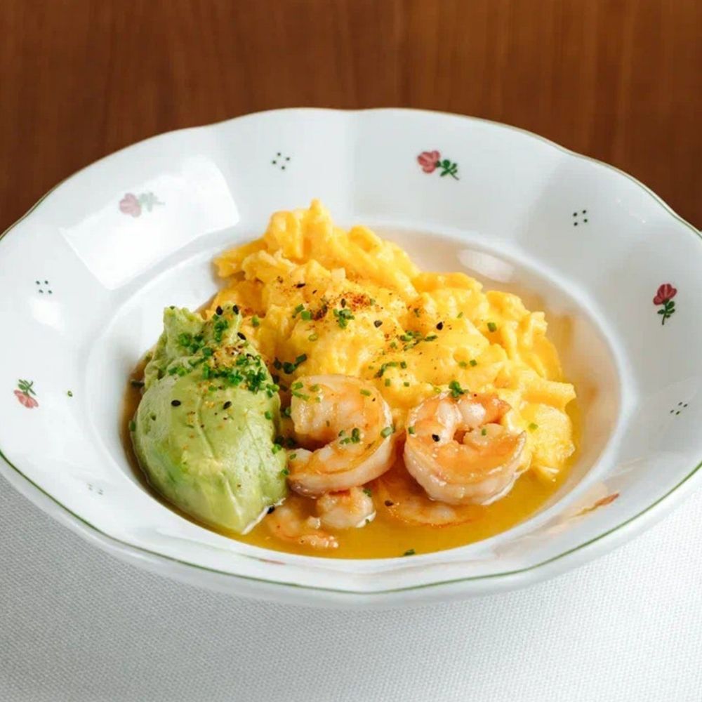 Скрембл (три яйца, оливковое масло), креветки, обжаренные на сливочном масле с добавлением печеного чеснока и цитрусового понзу. Мятое авокадо с лаймом, шичими, лук-шнитт