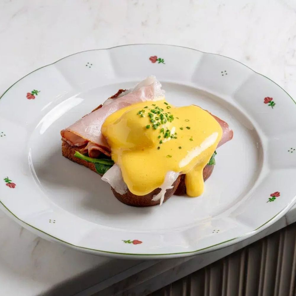 Тост хоккайдо, яйцо пашот, ветчина, шпинат, голландский соус (сливочное масло, лимонный сок, яичный желток), лук-шнитт