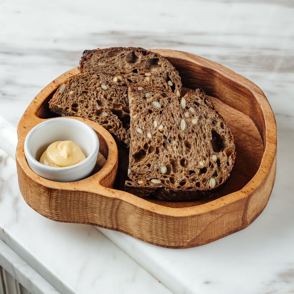 Пшеничный цельнозерновой хлеб из ржаной муки с тыквенными семечками и семенами подсолнуха, сливочное мисо-масло с чесноком
