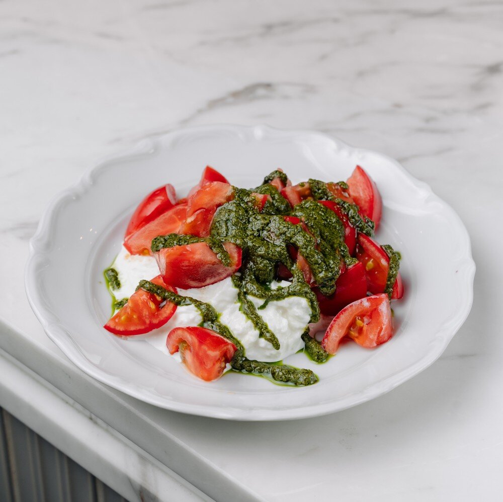 Сыр страчателла, томаты свежие, соус песто (масло оливковое, масло растительное, базилик свежий, орех кедровый, чеснок, соль, специи), базилик свежий, масло оливковое