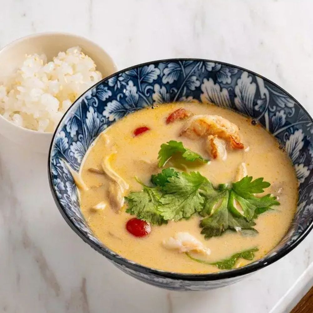 Том ям база (бульон куриный, молоко кокосовое, сок лайма свежевыжатый, соус рыбный, сахар, паста том ям, лук-шалот свежий, листья лайма, перец чили, корень галангала), рис отварной, томаты черри, креветки отварные, кальмары отварные, мясо мидий, молоко кокосовое, грибы вешенки, кунжут, кинза свежая