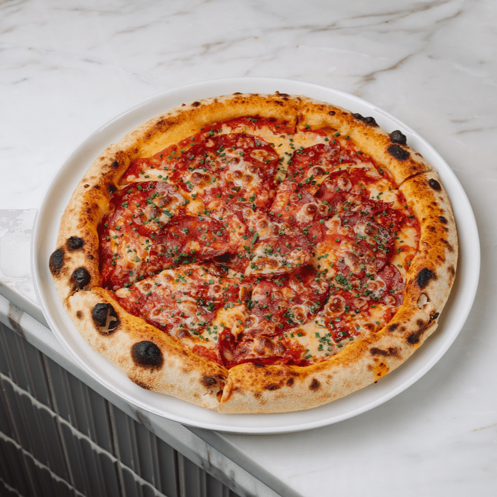 Неаполитанская пицца с пышным бортиком и тонкой основой (мука из мягких сортов пшеницы, дрожжи живые, сухая итальянская закваска, вода, соль), томатный соус, сыр моцарелла, острая салями, острое масло, лук-шнитт (24 см)