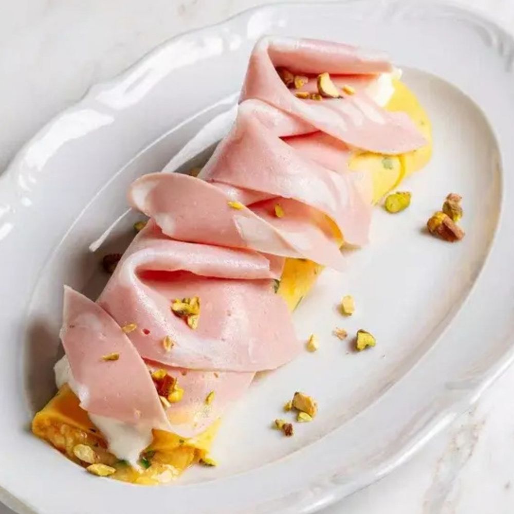Омлет (три яйца, рубленая петрушка, оливковое масло), страчателла, мортаделла с фисташкой, молотая фисташка