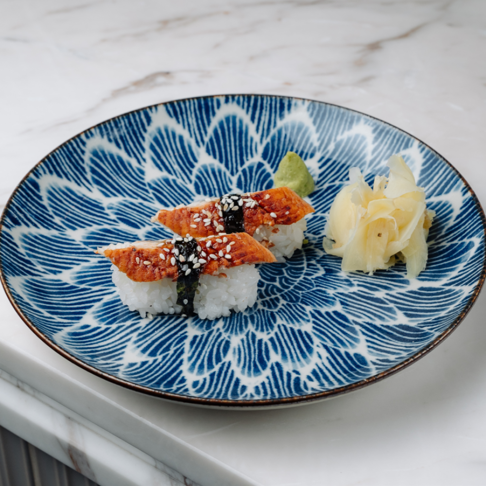 Рис для суши (рис отварной, уксус рисовый, сахар белый), филе угря копченого, имбирь маринованный, натуральный васаби (2 шт.)