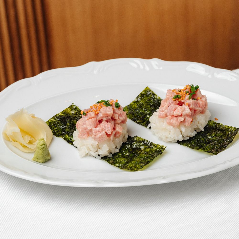 Рис для суши (рис отварной, уксус рисовый, сахар белый), филе тунца, спайси-соус, спайси-кунжут, имбирь маринованный, натуральный васаби (2 шт.)