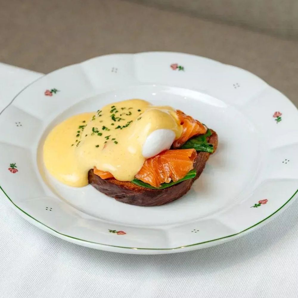 Тост хоккайдо, яйцо пашот, лосось слабой соли, шпинат, голландский соус (сливочное масло, лимонный сок, яичный желток), лук-шнитт