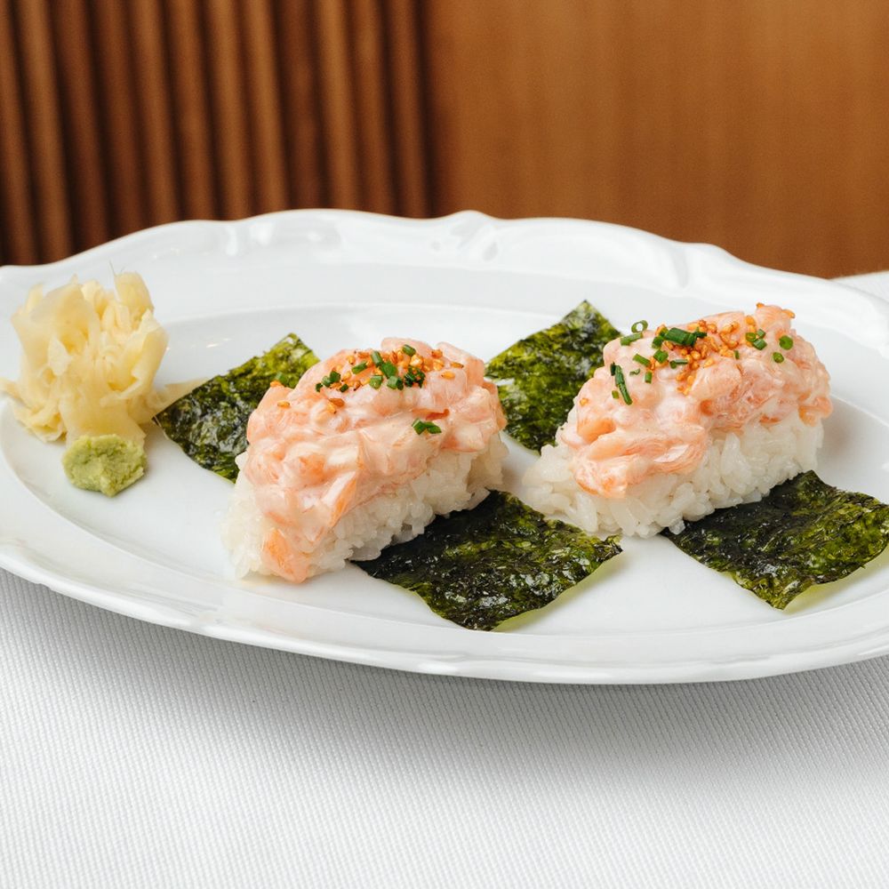 Рис для суши (рис отварной, уксус рисовый, сахар белый), охлажденный лосось, спайси-соус, спайси-кунжут, имбирь маринованный, натуральный васаби (2 шт.)