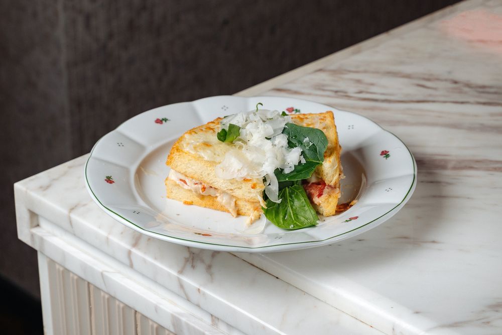 Тост хоккайдо, сыр моцарелла, соус тоннато (майонез 67%, тунец консервированный, сливки 33%, масло растительное, каперсы консервированные, анчоусы консервированные), томаты свежие, ветчина, шпинат свежий, сыр пармезан