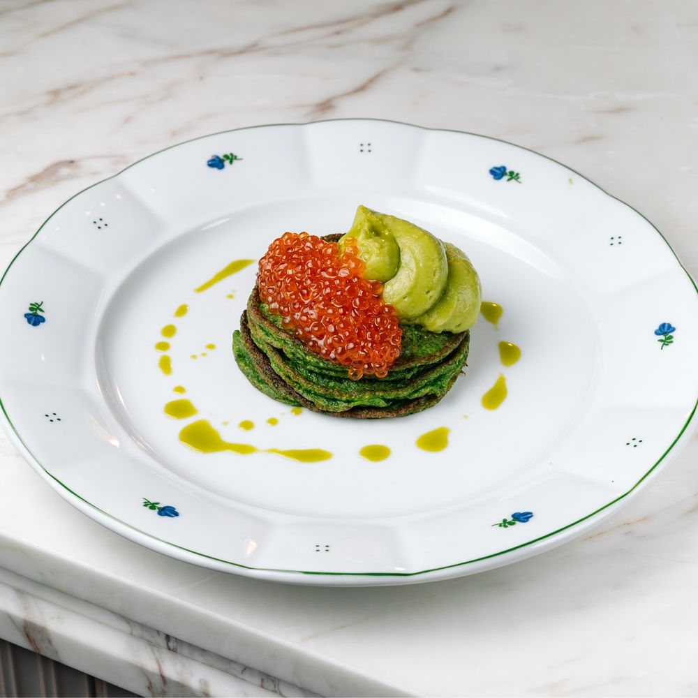 Оладьи (кабачок, молоко, шпинат свежий, яйцо куриное, мука пшеничная, сахар, соль, разрыхлитель), гуакамоле (авокадо, сок лайма, масло оливковое, перец чили, кинза, соль), икра лососевая, масло оливковое