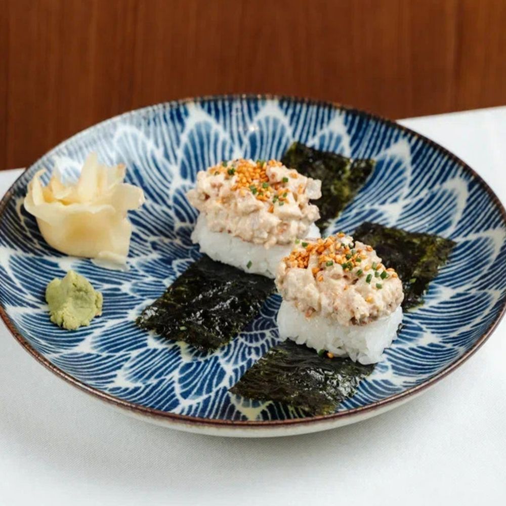 Рис для суши (рис отварной, уксус рисовый, сахар белый), филе угря копченого, спайси-соус, спайси-кунжут, имбирь маринованный, натуральный васаби (2 шт.)