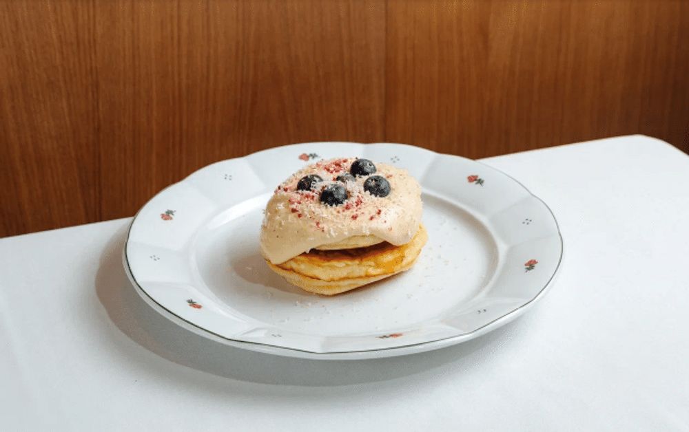 Оладьи (кефир, мука пшеничная, яйцо куриное, сахар, соль, разрыхлитель), крем из вареной сгущенки (сгущенка, сметана, сливки), сублимированная малина, орех пекан