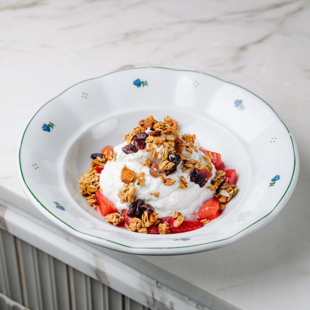 Взбитый творог с гранолой и клубничным компоте