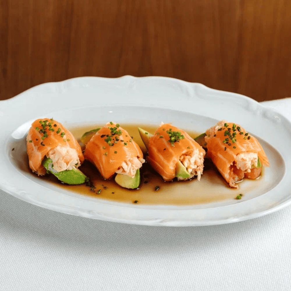 Ролл без риса, авокадо, краб, кунжут, лосось, спайси-соус, цитрусовый понзу