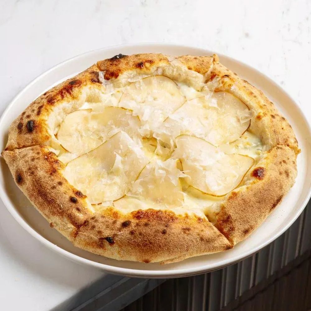 Неаполитанская пицца с пышным бортиком и тонкой основой (мука из мягких сортов пшеницы, дрожжи живые, сухая итальянская закваска, вода, соль), сливочный соус, сыр моцарелла, сыр горгонзола, сыр пармезан, слайсы свежей груши, масло оливковое (24 см)