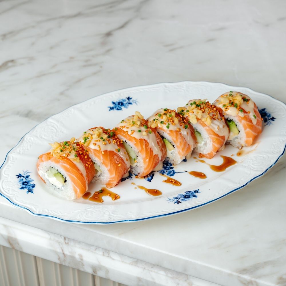 Рис для суши (рис отварной, уксус рисовый, сахар белый), охлажденный лосось, сыр сливочный, огурцы свежие, авокадо, соус терияки (Соевый соус, мирин, саке, сахар, стружка тунца бонито), соус понзу (апельсиновый фреш, лимонный фреш, мицукан, сахар, лук-шалот), сухари кранч, водоросли нори, соус соевый, имбирь маринованный, натуральный васаби хрен (6 шт.)