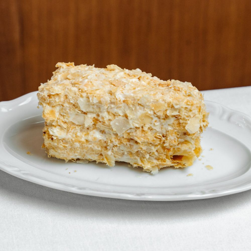 Воздушные хрустящие коржи из слоеного теста, сливочный крем патисьер с карамелью (карамель, сливки, сахар, ваниль, яйцо, сливочное масло, кукурузный крахмал)