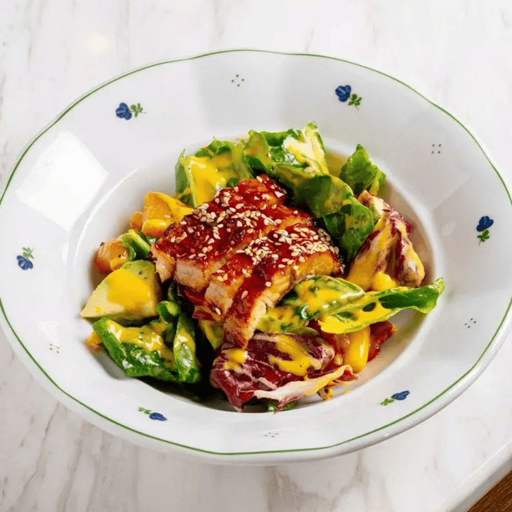 Угорь, копченный в соусе унаги, манго свежий, кукуруза консервированная, перец болгарский запечённый, авокадо, манговый соус (пюре из манго, масло растительное, яйцо куриное), салатный микс (шпинат свежий и радичио свежие), лук репчатый маринованный (лук репчатый свежий, свекла, сахар, соль)