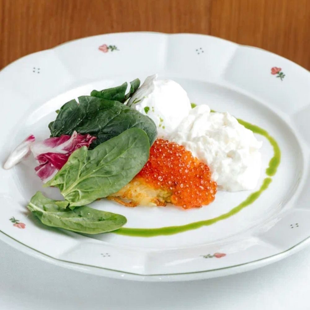 Драник (картофель, яйцо куриное, мука пшеничная, лук-шалот, масло растительное, соль, специи), салатный микс (шпинат и радичио свежие), страчателла, яйцо пашот, красная икра, зелёное масло