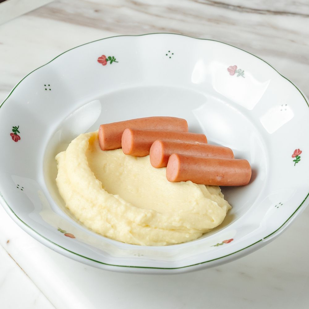 Пюре картофельное (картофель отварной, сливочное масло, сливки, молоко, соль), отварные сосиски (курица, говядина, свинина)