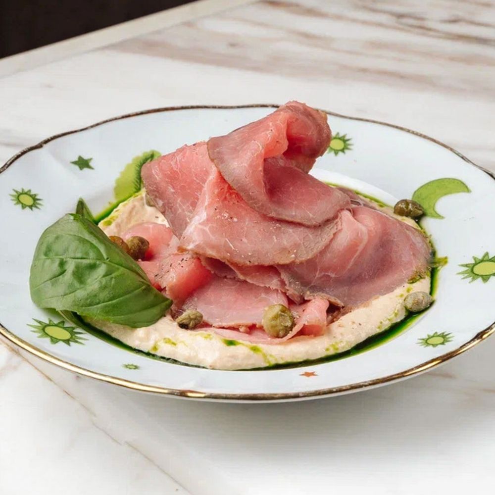 Вителло слайсы (говядина, лангет маринованная с тимьяном, розмарином, чесноком, приготовлена су-вид), соус тоннато на основе майонеза, сливок, тунца, консервированных каперсов и анчоусов. Украшаем каперсами, зеленым маслом