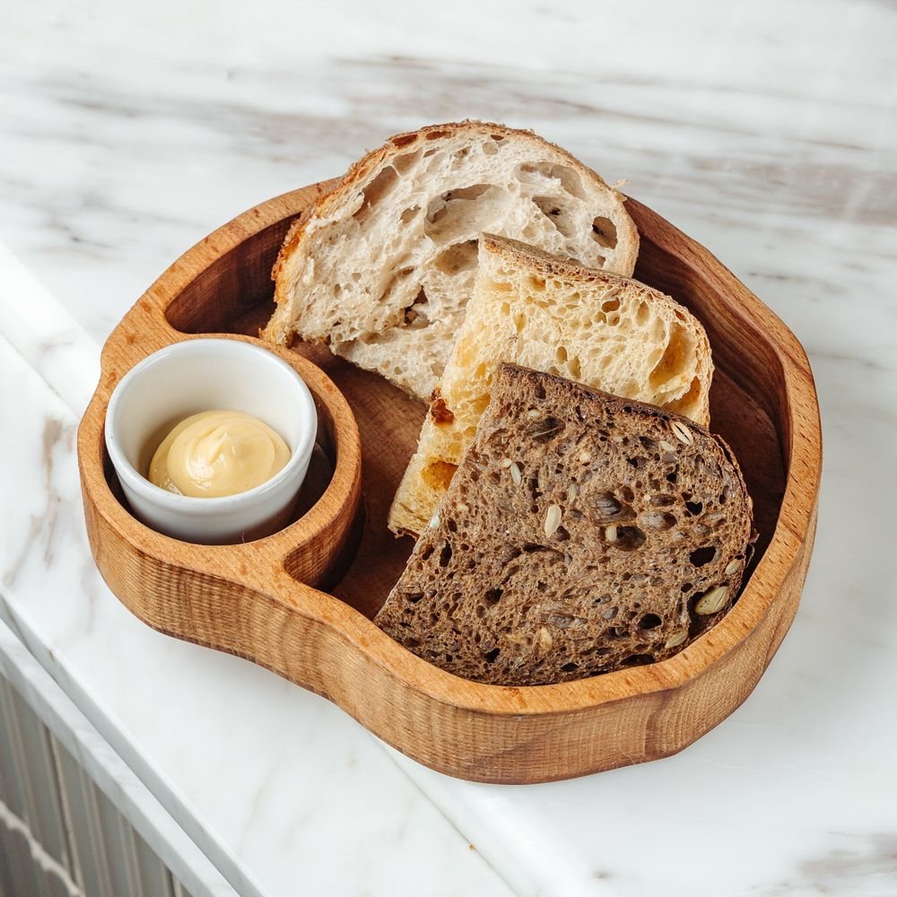 Тартин, зерновой хлеб, хоккайдо, сливочное мисо-масло с чесноком
