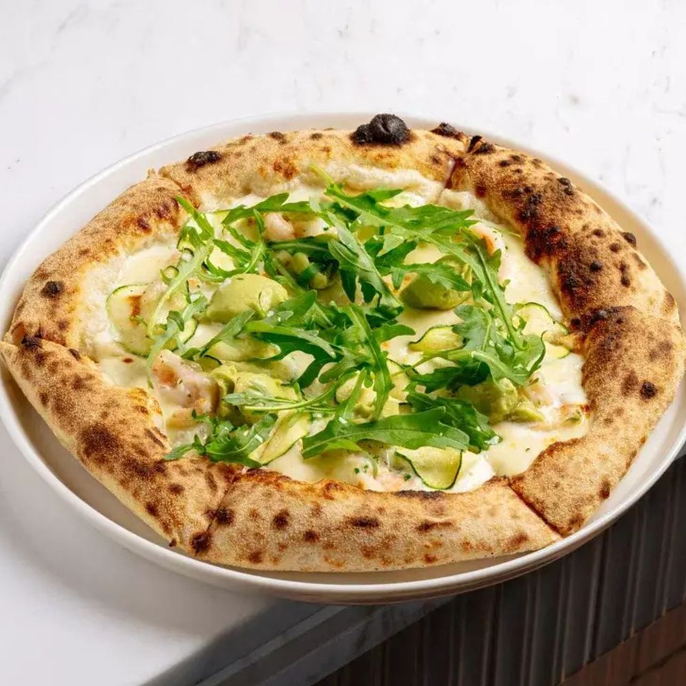 Неаполитанская пицца с пышным бортиком и тонкой основой (мука из мягких сортов пшеницы, дрожжи живые, сухая итальянская закваска, вода, соль), сливочный соус, сыр моцарелла, креветки обжаренные, слайсы цукини, гуакамоле (авокадо, кинза, чили, лайм), руккола (24 см)