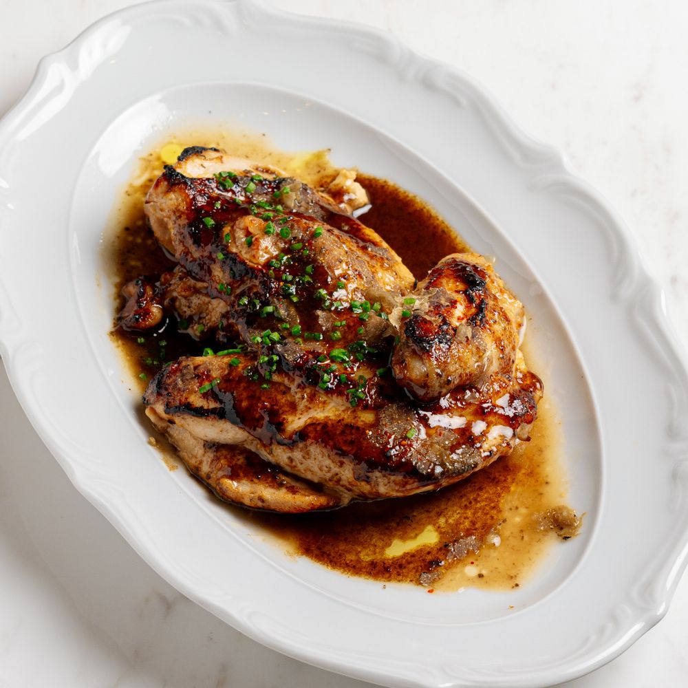 Цыпленок корнишон, маринованный с чесноком, пастой табаджан и сметаной, обжаривается в хоспере, подается с трюфельным соусом барбекю и слайсами черного трюфеля
